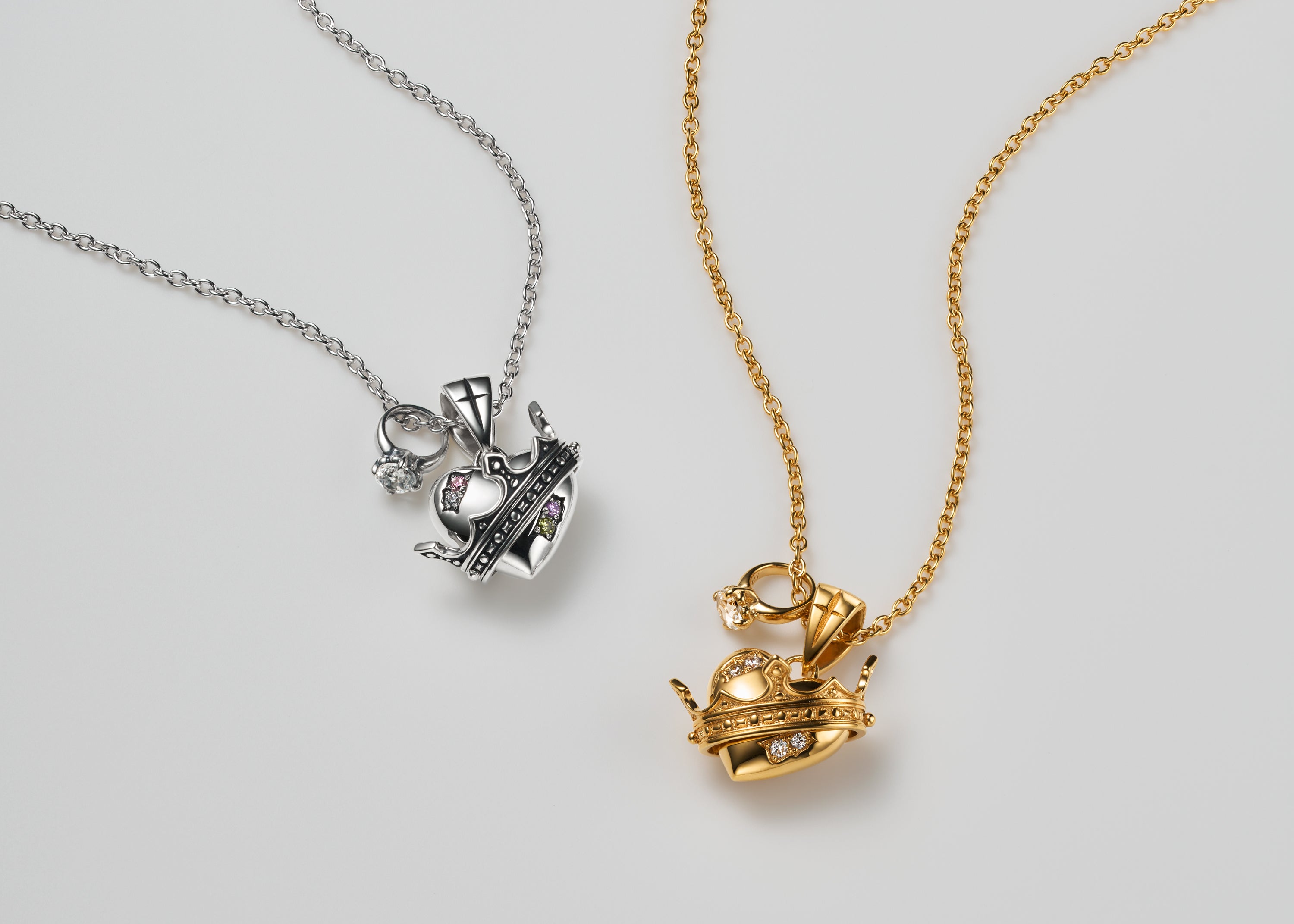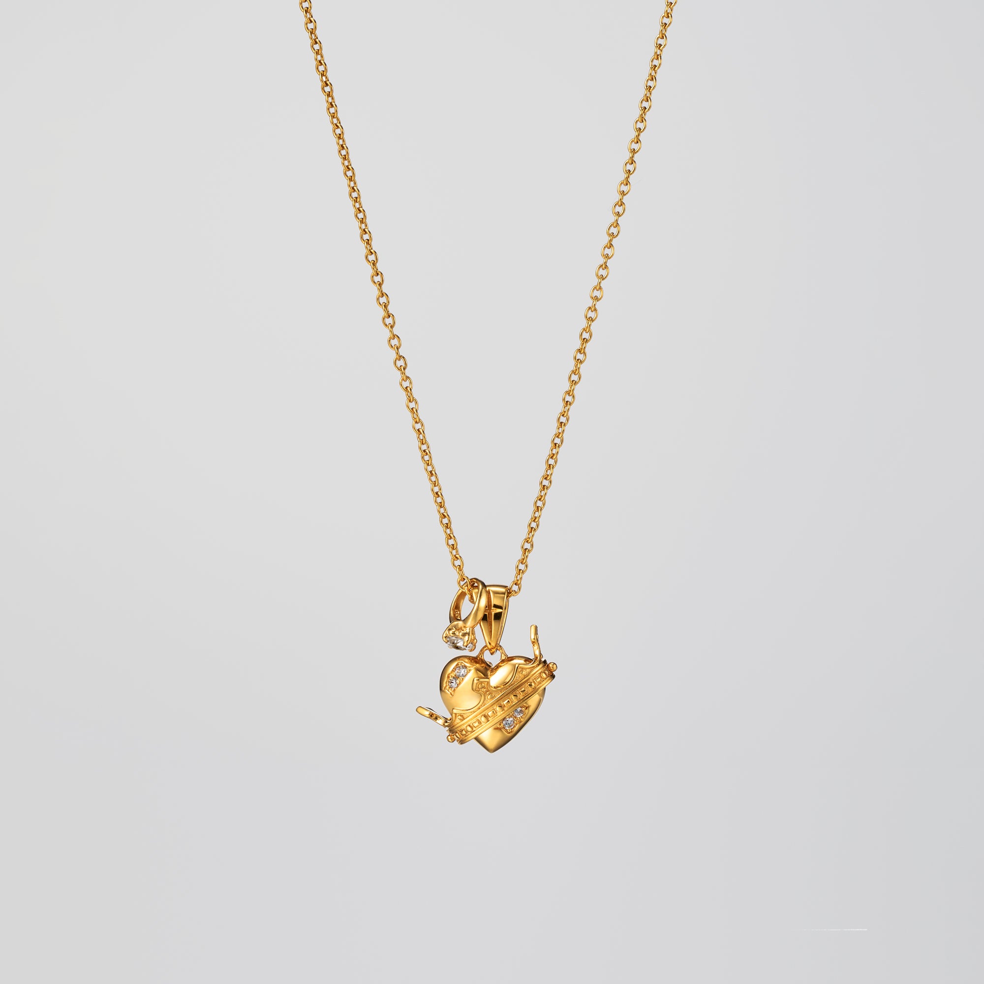シグネチャーなクラウンをセットしたハートシェイプのミニチャームに、プチリングが寄り添うスイートでノーブルなネックレス。