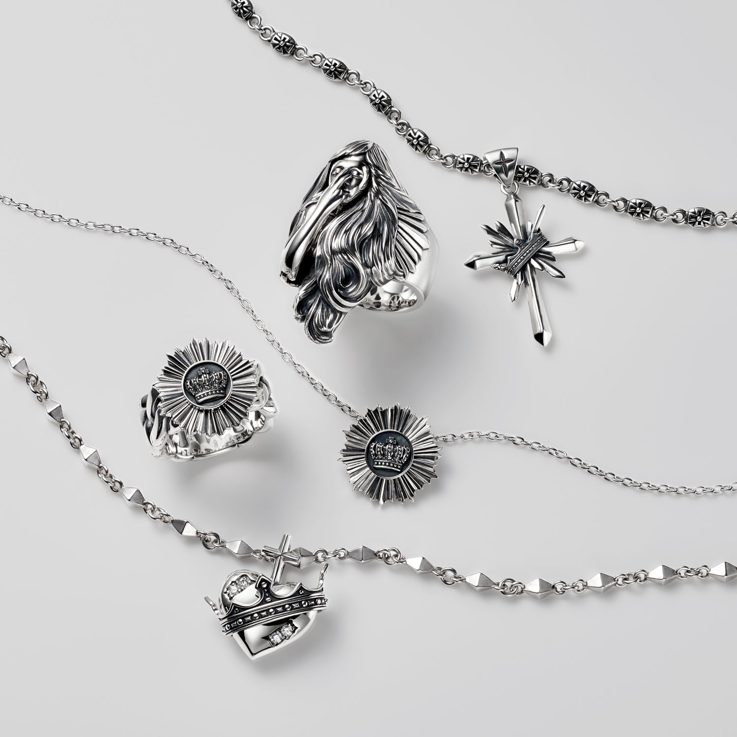 幸せをもたらす後光を表現したネックレスなど全13型のジュエリーを展開。