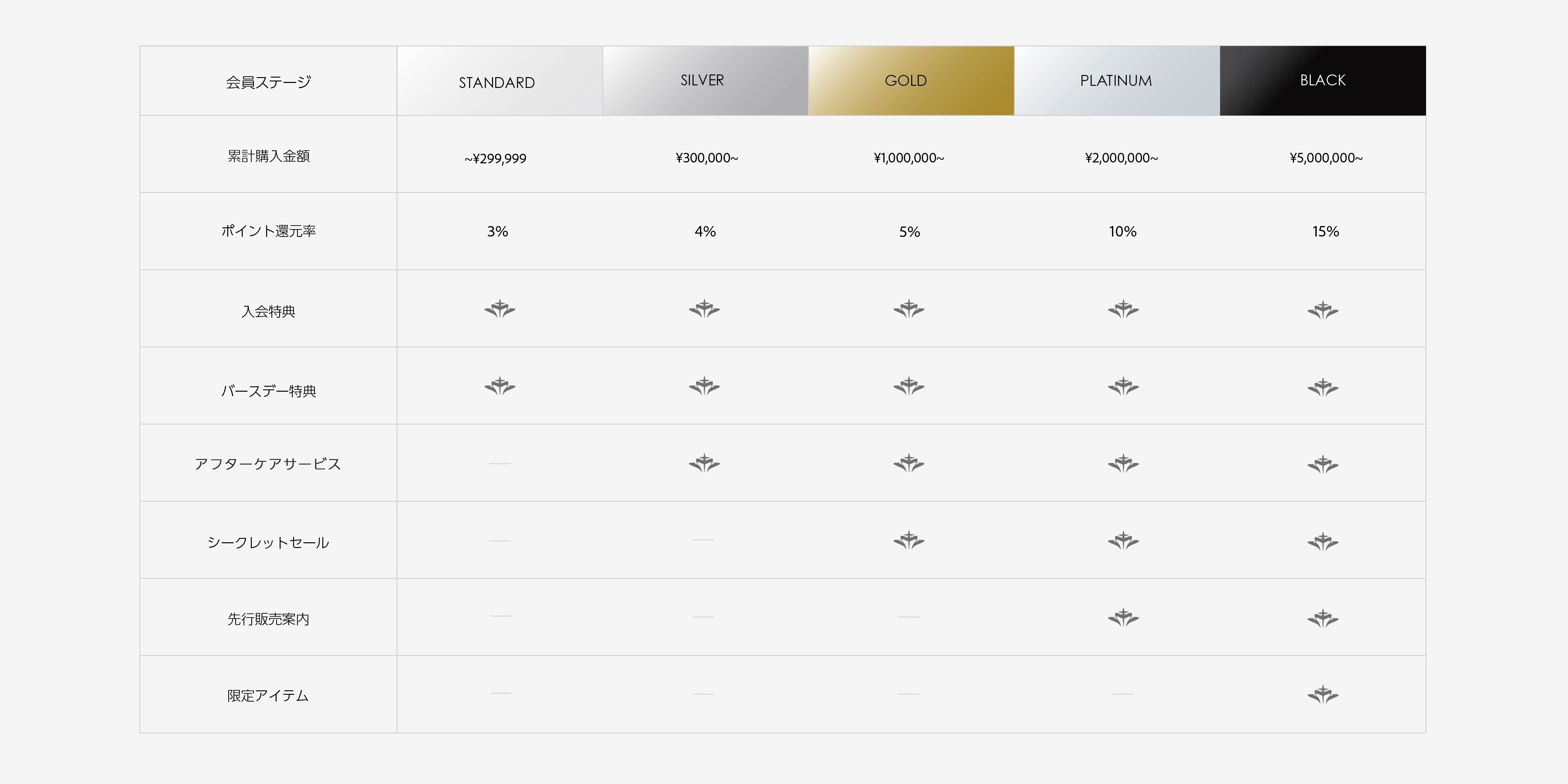 また、ご購入金額の累積に応じてステージランクがアップし、ステージごとに特別な特典をご用意しております。