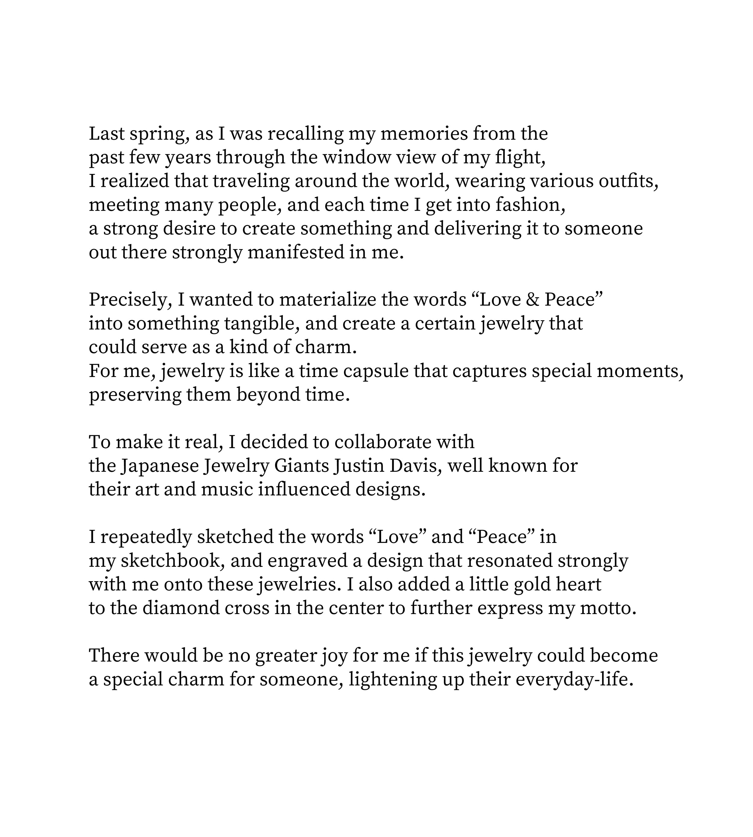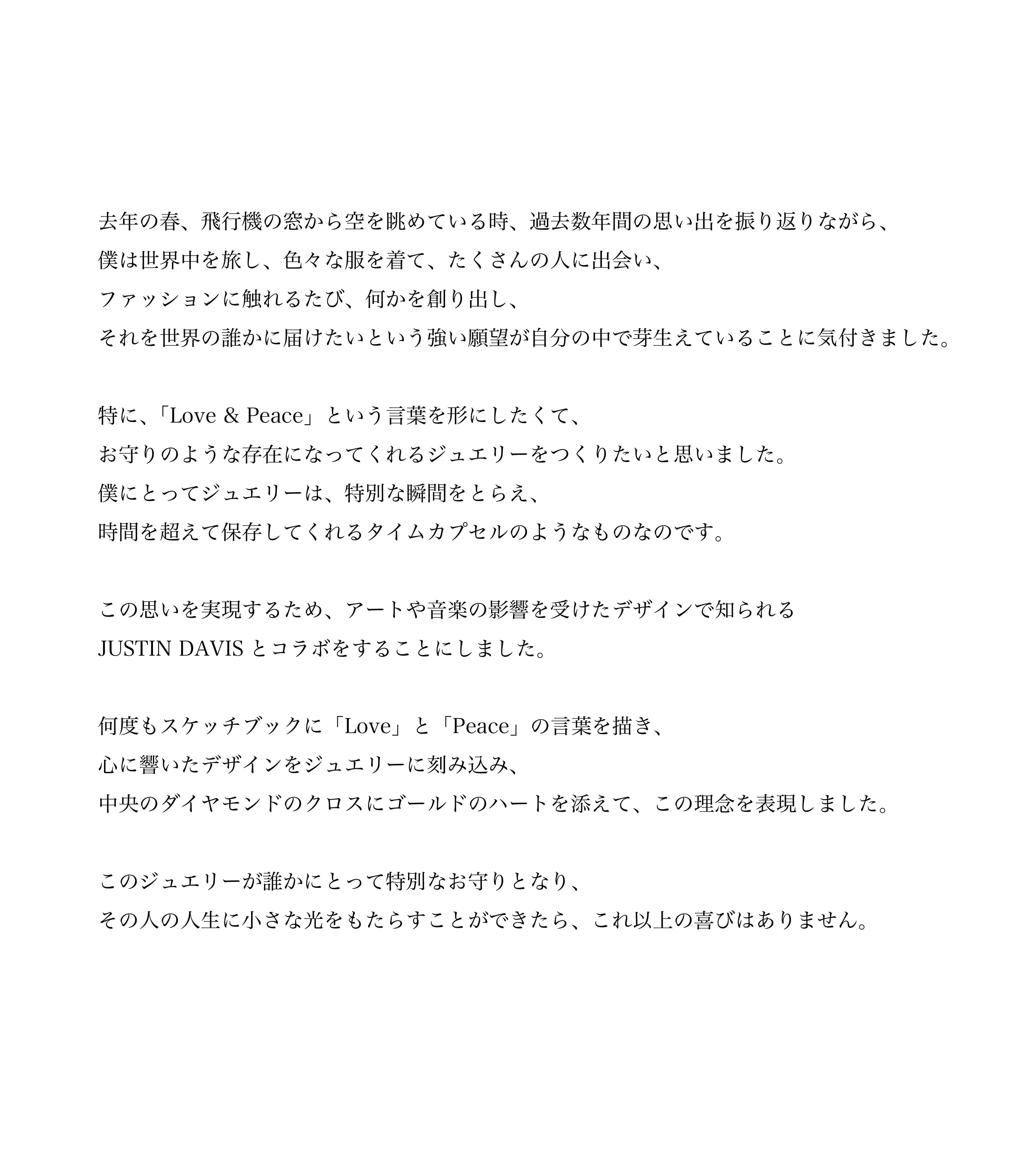 ジュエリーブランドとのコラボは初となり、その記念すべくアイテムはジャスティン デイビスのロングセラージュエリーでもある EMINEM(エミネム) シリーズに井上ヤマトのモットーである Love & Peace を表現したデザインのネックレス1型2⾊とリング1型2⾊が登場。